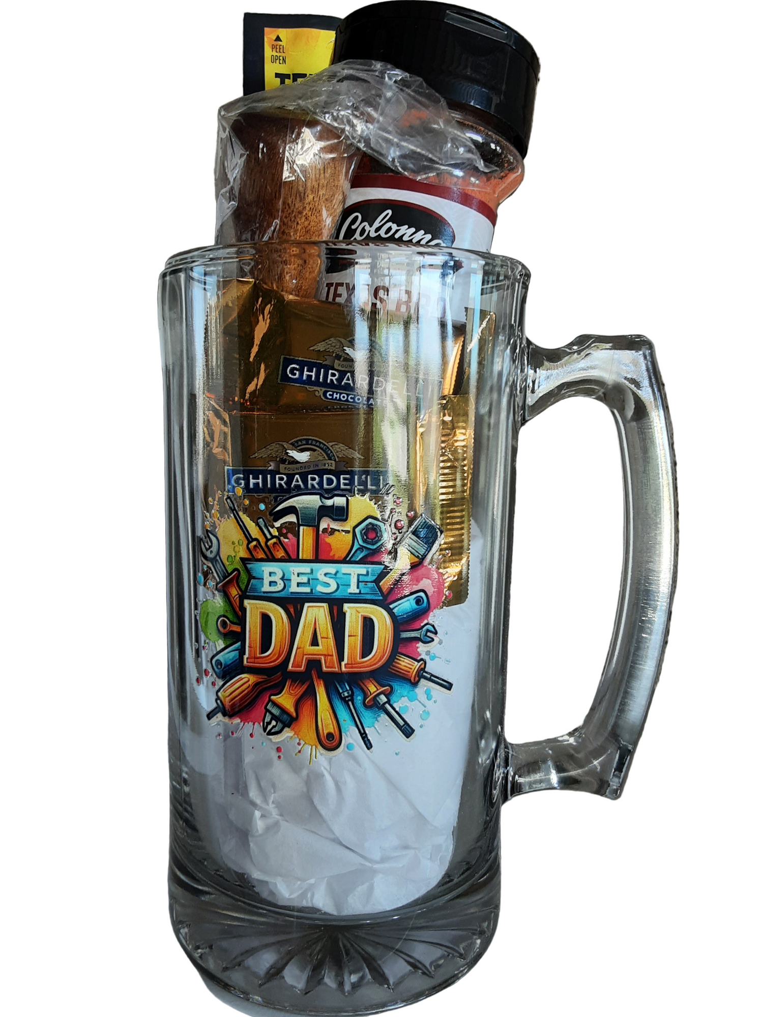 Enhance your drinking experience with our Hand Decorated Glass Beer Mugs. Choose from various sayings and enjoy the added bonuses of Jack's Beef Steak, Acadia Wood Bottle Opener, Ghirardelli Chocolate Squares, and BBQ Seasoning. Satisfy your hunger while enjoying a refreshing cold brew, perfect for any occasion.