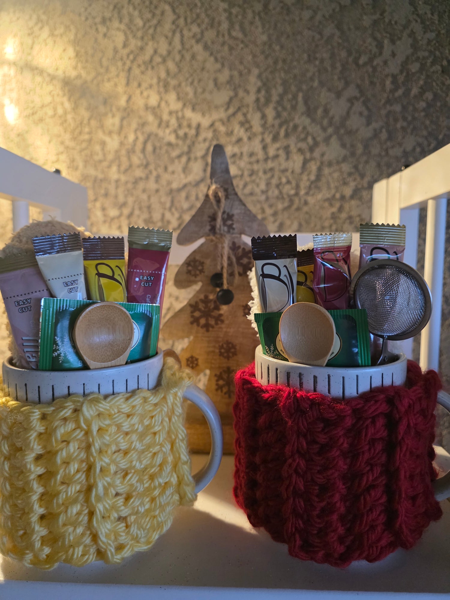 Stay warm and cozy this winter with our Winter mug. Made with a crocheted warmer, this mug comes in multiple colors to choose from. Plus, it includes 4 delicious types of coffee, 1 type of tea, a tea spoon, tea strainer, and a pair of comfy socks. Perfect for snuggling up by the fire.