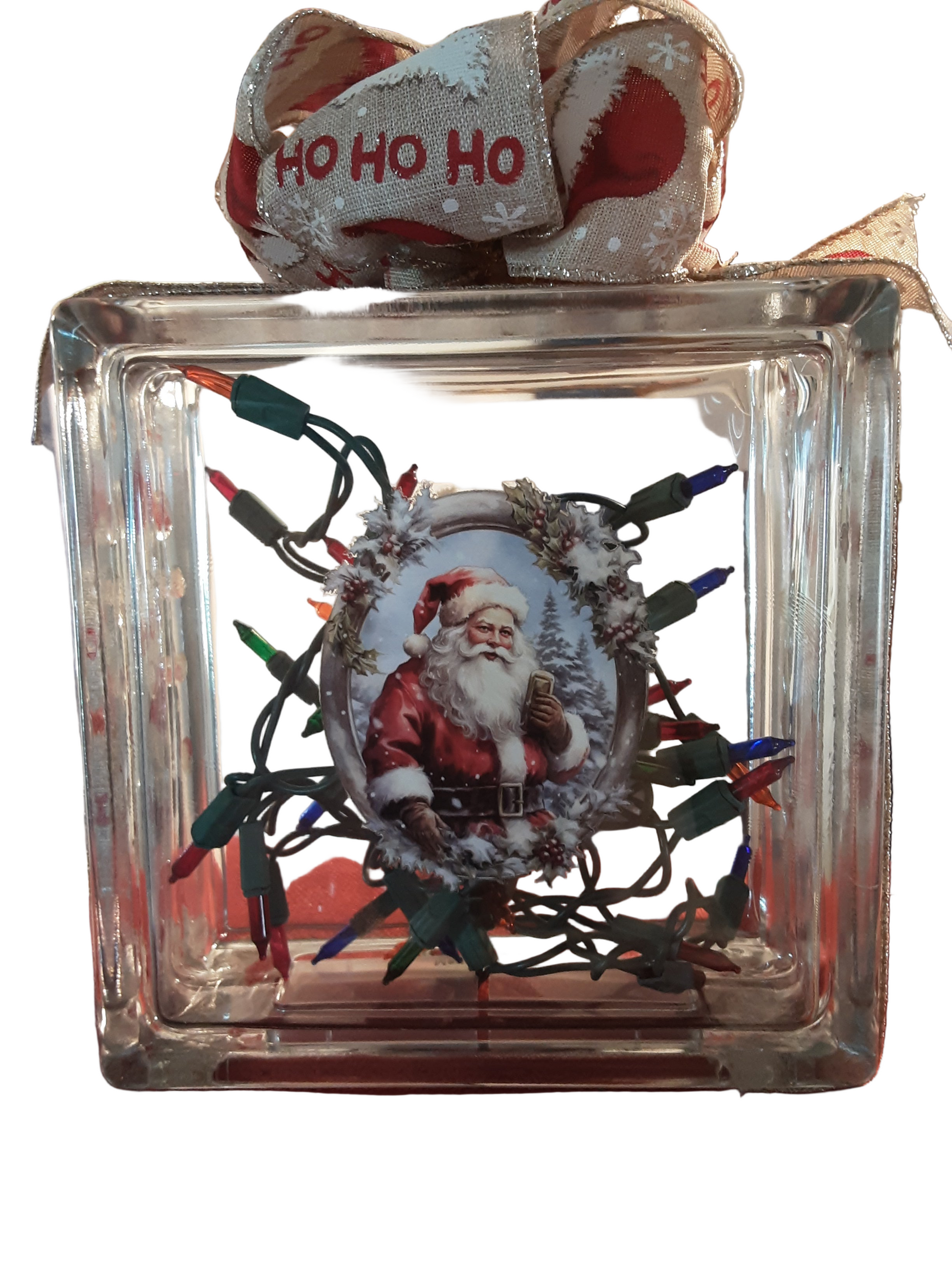 Illuminate your holiday decor with our Christmas Glass LiteUP Box. This hand-decorated box features a vintage classy style and includes multi-color lights inside, creating a festive ambiance. Plus, with 3 extra light bulbs and 1 extra fuse included, you can enjoy the season worry-free. Simply plug in and let the big bow on top add a touch of Santa's magic. Size is 7.5 inches down x 7.5 inches across.