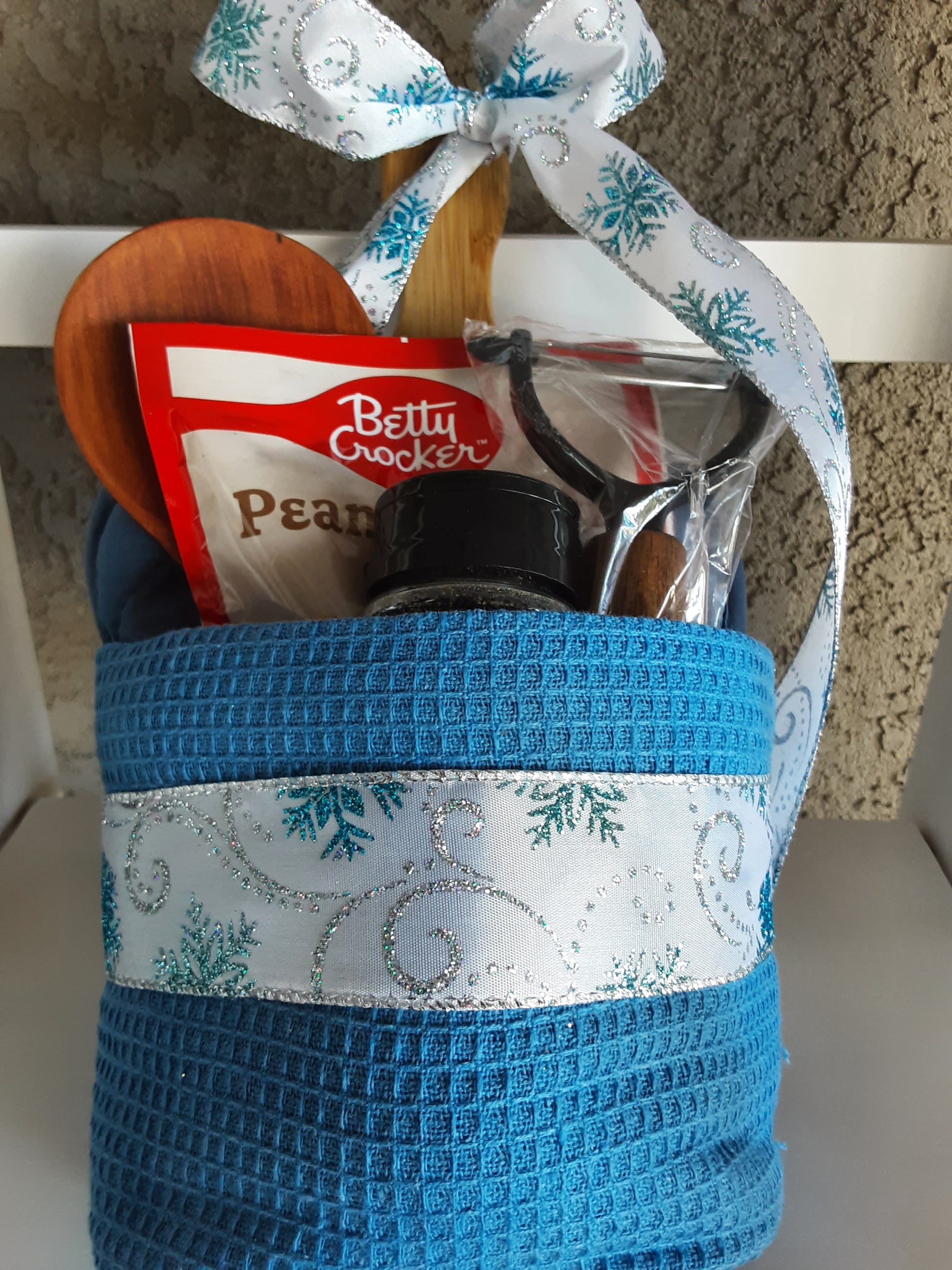 The perfect holiday gift set for your special someone or co-worker. This set includes a wooden cutting board, kitchen towel, two potholders, and wooden flat spoon for cooking. Also included are a wooden handled peeler, package of peanut butter cookie dough, and Garlic& herb seasoning. Each gift set comes beautifully wrapped in a clear plastic bag with a bow. Show your appreciation with this thoughtful and practical gift.
