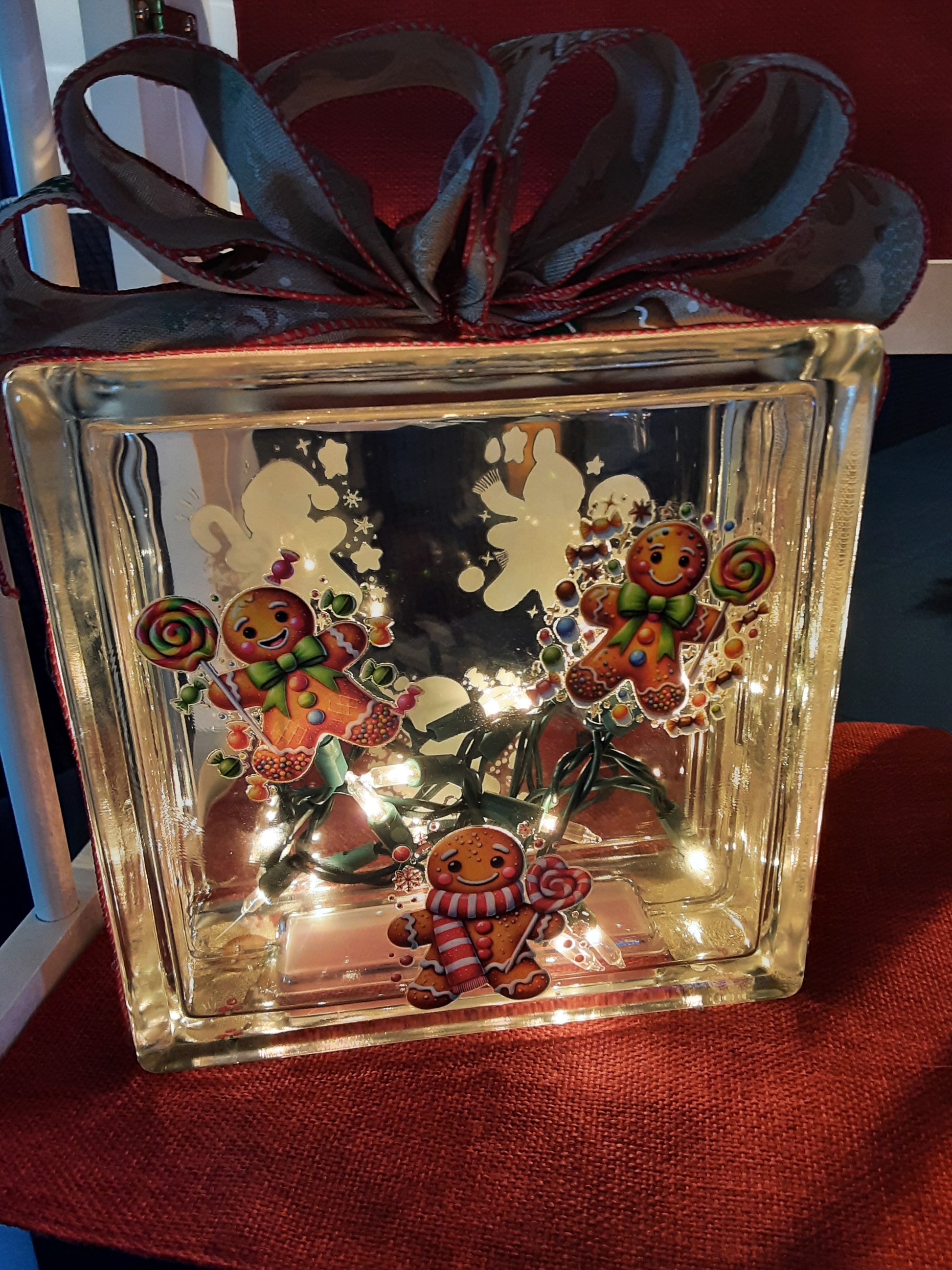 This hand-decorated Gingerbread Glass Lite-Up Box is a festive must-have for all gingerbread lovers. Measuring 7.5in x 7.5in, this box features multi-color lights inside and a big gingerbread bow on top. Plug it in and add a touch of holiday cheer to any room. Includes 3 light bulbs and 1 extra fuse.