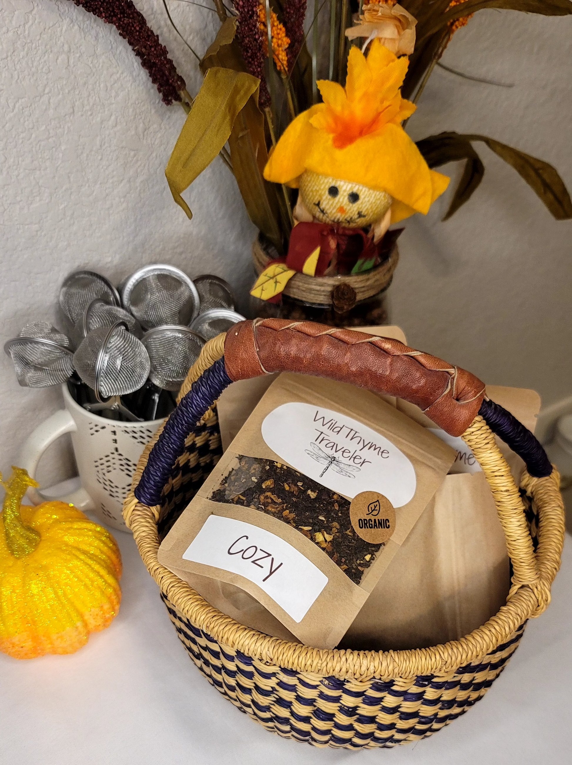 Discover the rich, "Cozy" flavors of Wild Thyme Traveler Tea by Anjeanette Mitchell. This organic blend features Orange Spice Black Tea, Ginger, and Cocoa Nibs for a distinct and invigorating taste. Perfect for any tea lover and expertly crafted with high quality ingredients.